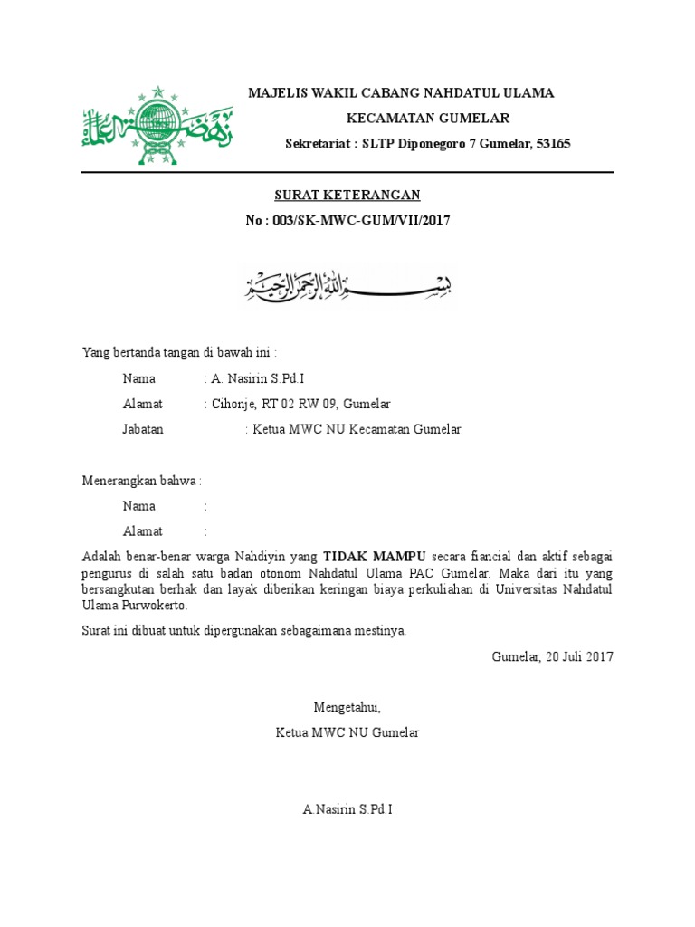 for "Contoh Surat Rekomendasi Mwc Nu - Pedoman Administrasi Organisasi Nu Konbes 2012"